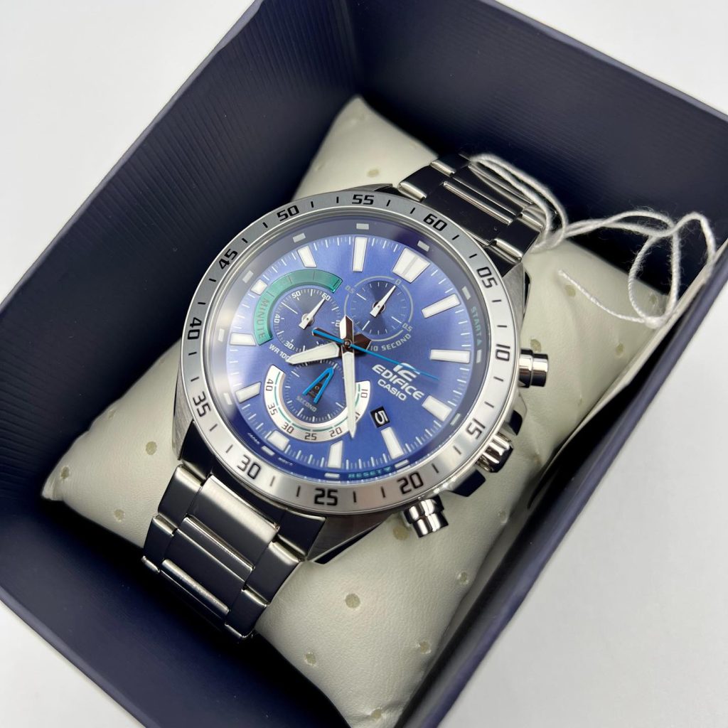 EFV-620D-2A là sự kết hợp hoàn hảo giữa phong cách thể thao và vẻ đẹp cổ điển. Được lấy cảm hứng từ bộ môn đua xe thể thao, sản phẩm này kết hợp màu sắc sống động và mặt số lồng nổi bật, tạo nên phong cách toát lên vẻ đẹp của tốc độ và trí tuệ. Với kiểu dáng tròn cổ điển hay kiểu vòng cung mới lạ, EFV-620D-2A luôn kích thích được sự tò mò cũng như mong muốn khám phá nó của các nam thanh niên. Mặt đồng hồ là sự pha trộn giữa 2 màu sắc xanh dương và xanh lá, tạo nên sự cuốn hút đặc biệt.