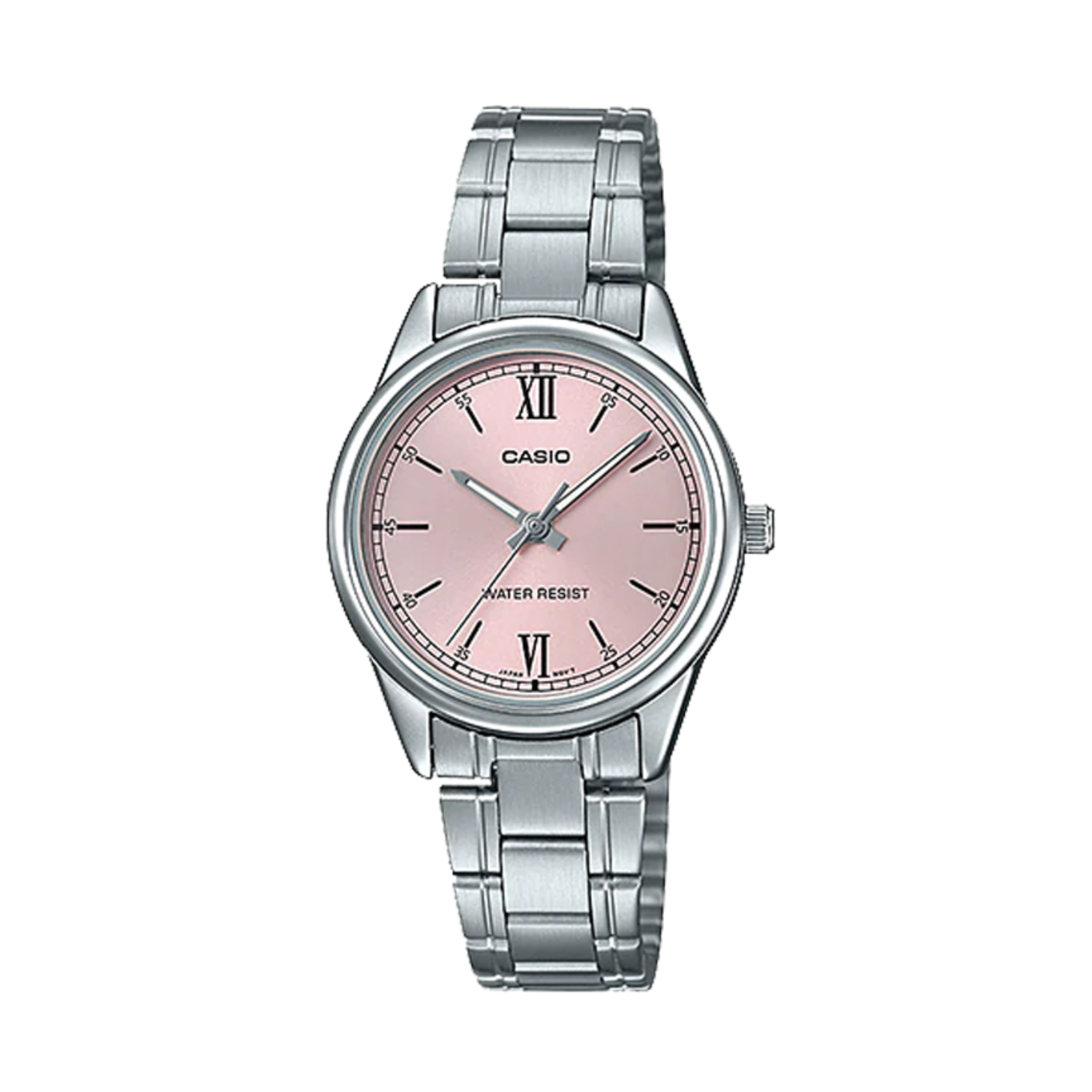 Điểm đắt giá nằm ở mặt số hồng pastel dịu mắt – sắc độ rất nữ tính nhưng không hề “bánh bèo”. Kim chỉ và các cọc số được làm bằng kim loại đen nổi bật, chi tiết kim còn được phủ lớp dạ quang nhẹ màu trắng ánh xanh, hỗ trợ quan sát tốt hơn trong môi trường thiếu sáng. Mặt kính bằng Mineral Crystal – cứng cáp, chịu va đập tốt và dễ đánh bóng khi cần khôi phục.