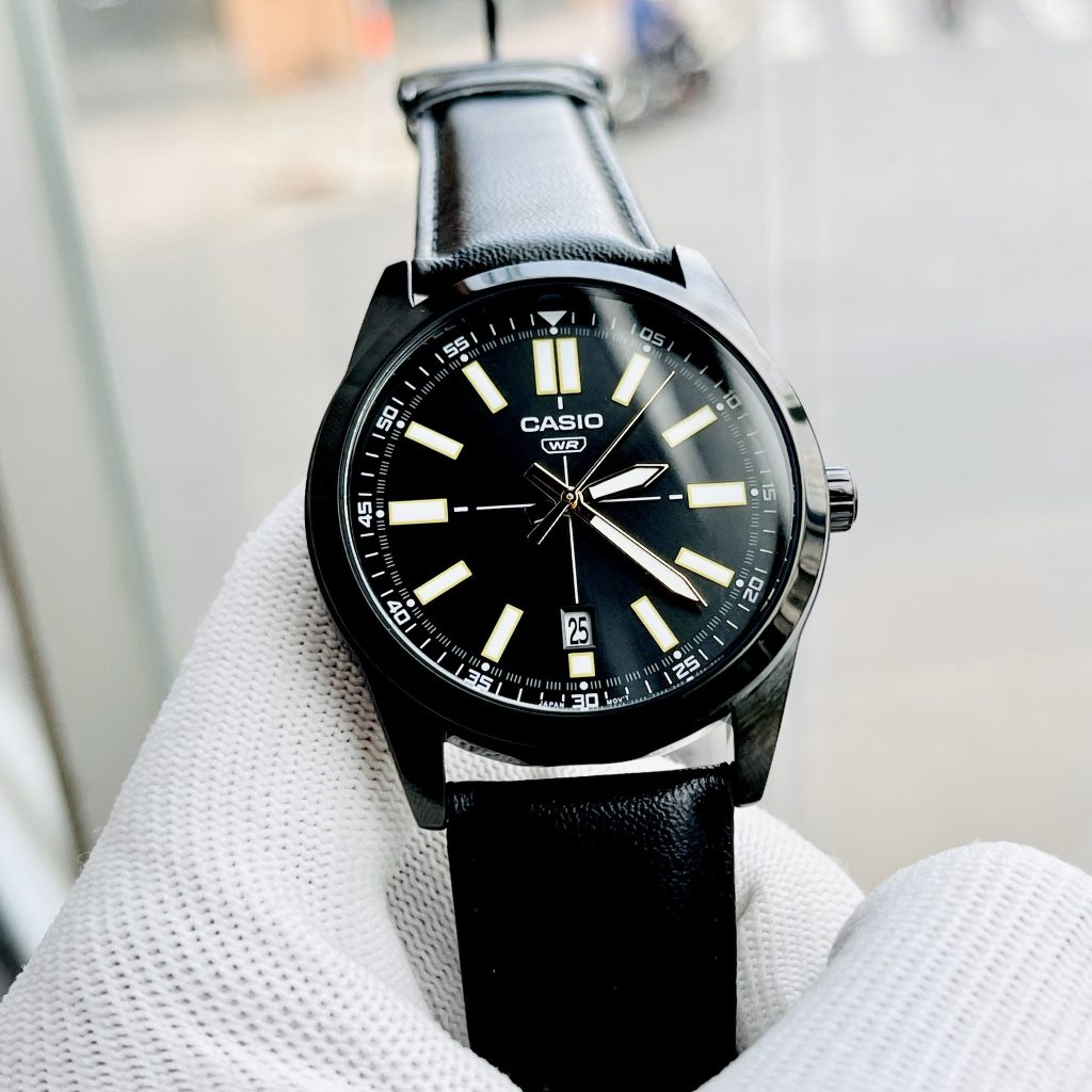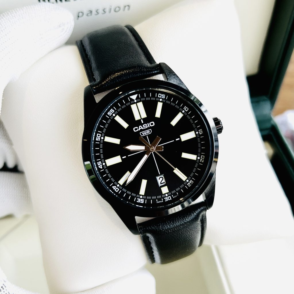 MTP-VD02BL-1E mang một vẻ ngoài lôi cuốn ngay từ cái nhìn đầu tiên. Dây da đen và mặt đồng hồ tạo điểm nhấn mạnh mẽ, tạo ra một sự kết hợp hoàn hảo giữa cổ điển và hiện đại. Khung máy được mạ ion đen tạo nên sự sang trọng và đẳng cấp, làm nổi bật vẻ đẹp của chiếc đồng hồ.
