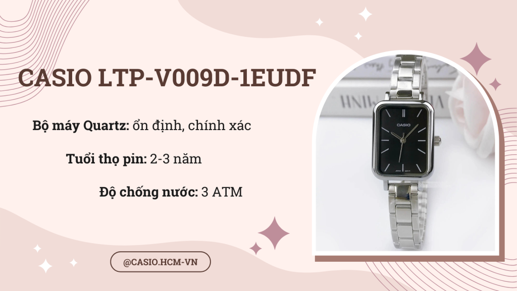 Đồng hồ nữ Casio Nữ LTP-V009D-1EUDF được thiết kế đặc biệt với sự tinh tế trên từng góc cạnh. Dây đeo bằng thép bạc sáng, sang kết hợp với những thiết kế tinh tế của mặt đồng hồ hình chữ nhật làm tăng sức hút hấp dẫn, cá tính và sự sang trọng. Hy vọng bài viết này đã đem đến cho bạn cái nhìn trực quan hơn về sản phẩm.