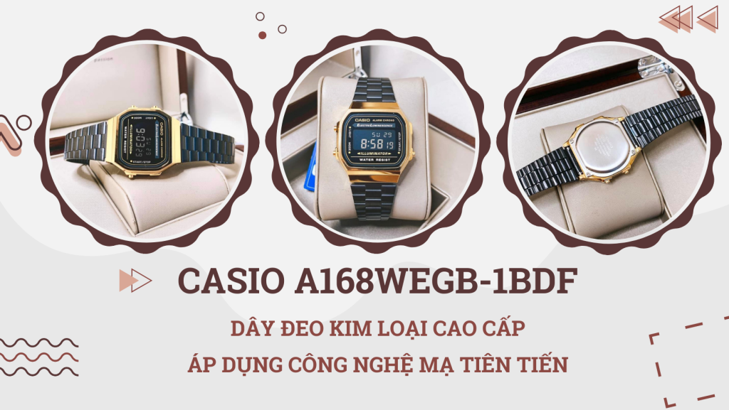 3. Casio A168WEGB-1BDF được thiết kế với dây đeo kim loại cao cấp và áp dụng công nghệ mạ tiên tiến