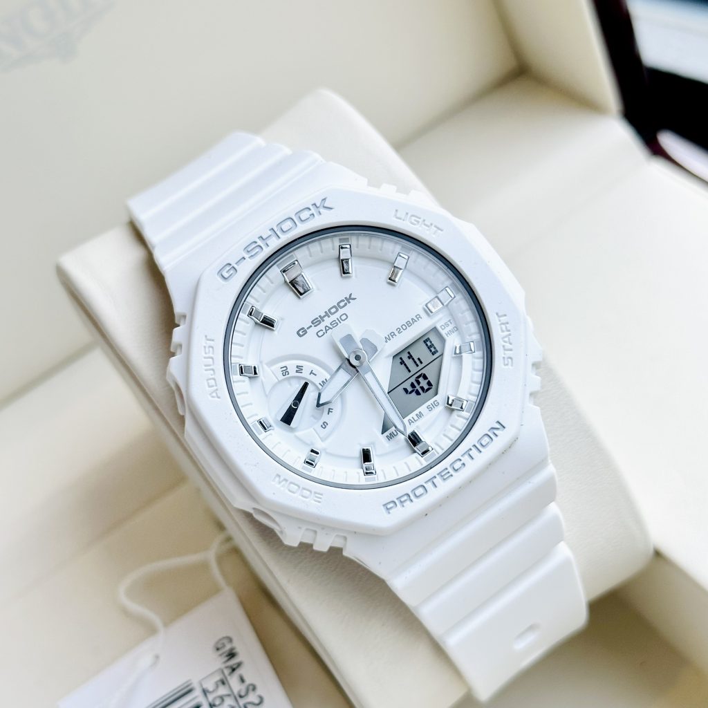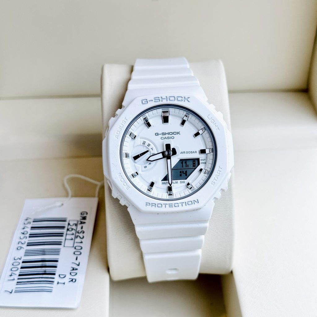Nếu các cô nàng yêu thích thể thao nhưng lại không thích kiểu dáng của dòng Baby-G thì chúng mình có thể tham khảo ngay model đồng hồ G-Shock women này nhé. Casio G-Shock GMA-S2100 là phiên bản thu nhỏ của đồng hồ G-Shock GA-2100 nam, vẫn giữ nguyên kiểu dáng, chức năng chỉ thu nhỏ kích thước để đồng hồ được tối ưu và đẹp trên cổ tay các nàng.