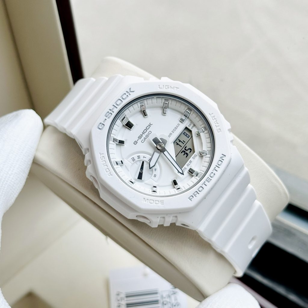 - Đồng hồ Casio G-Shock GMA-S2100-7A được khoác lớp áo cá tính và nổi bật với tông trắng chủ đạo, phần cọc số cùng kim phản quang hiển thị to, đậm, rõ nét, các chi tiết được thiết kế nổi tạo chiều sâu giúp người dùng dễ dàng quan sát thời gian.